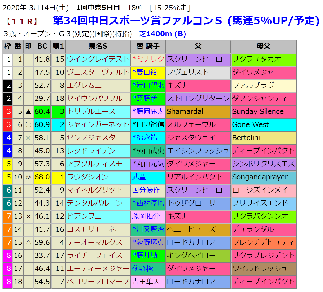 今週は土曜日に重賞レースが2鞍あります。それでも無観客はとても淋しい限りです。基本的にここではこの時期は3歳戦中心に予想公開ですのでファルコンSの方をここに書きます。2015年は指数1位馬の14番人気馬が勝って馬連2万4千円的中の相性のいいレースなのです。