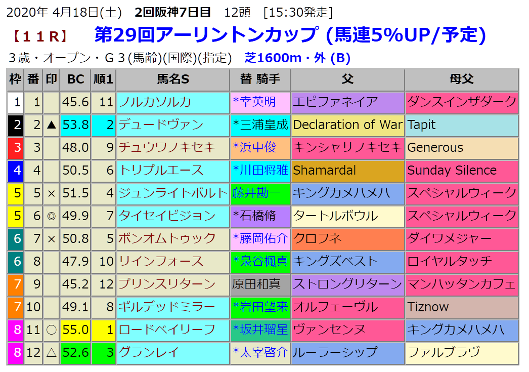 アーリントンCの予想です。指数1位はロードベイリーフですが、本命はタイセイビジョンです。タイセイビジョンは前走朝日杯FSで2着に好走しましたが、その時のBC-indexは13位でしたが今回は7位と順位を大きく上げています。こういう馬がBC-indexでは狙いとなります。そして相手が指数上位馬となります。