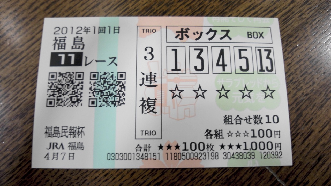 気になったのは、差しが決まるレースが多かったことです。騎手心理が影響しているのかもしれませんが、短い直線でも、しかもダートでも逃げ馬は直線で差されていました。今の福島競馬は単純に逃げ有利ではないのかもしれません。メインの福島民報杯はBC-index1~5位の3連複馬券等を勝ってみました(写真)。期待は13番ダノンスパシーバ(BC値2位)でした。前走の中京記念ではBC値が7位でしたから、重賞からオープン特別とクラスが下がって尚且つBC値が大きくアップしています。そして相手は後藤騎手の3番モンテエンと予想でした(このほかにも馬券はネットで買っています)。生馬券の配当は6,920円とまずまず。