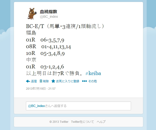 今日のBC-E/T作戦の買い目は昨日の10時ごろにTwitterでつぶやいていました。