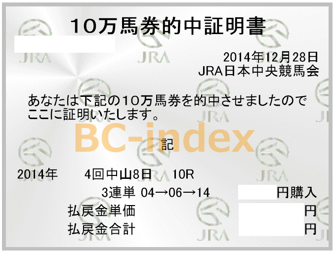 まずは昨年の自慢です。有馬記念はブログ予想では3連単が的中しました。3連単の配当は109,590円でした。BC-indexのないレースで的中ですからこのブログのメインテーマとは少し外れてはいますが、競馬予想をしている以上そんなことは関係なく有馬記念を的中できればそれで十分とも言えます。